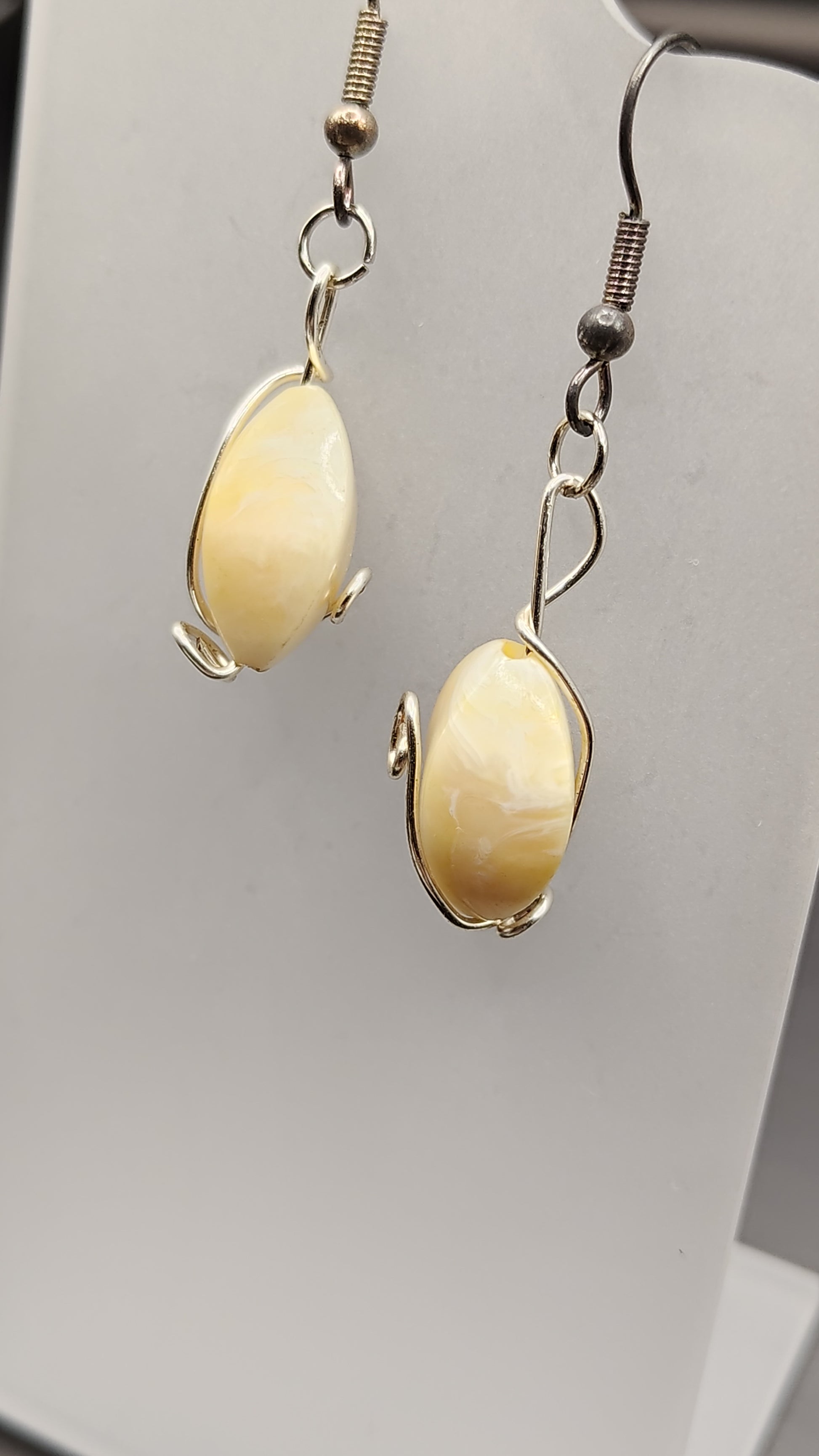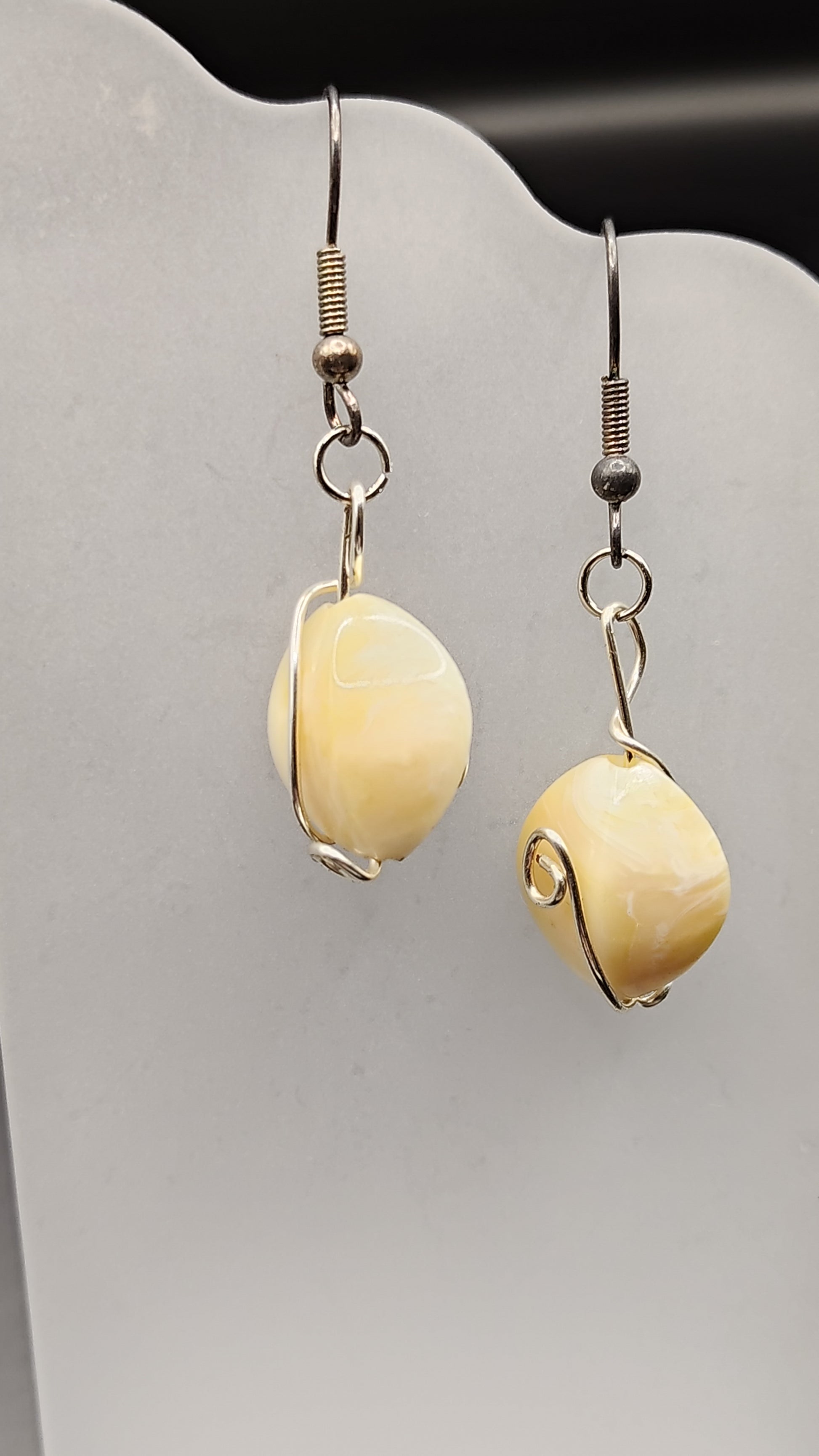 Bead Wrap earrings have brass or nickel wire wrap around and through the plastic color beads. The wire wrap was connected with a small nickel jump rings to help connect to the nickel fish hook earrings.
