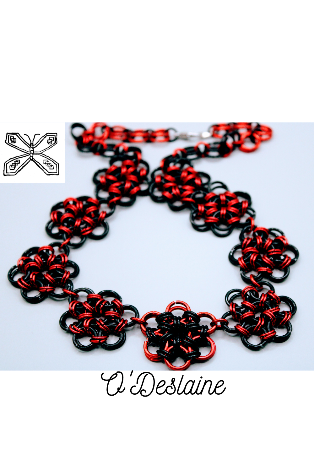 "Black and red enamel copper wire is wrapped into jump rings, which are connected into a Japanese Flower chainmail. The colors alternate between black on red and red on black for each flower. The necklace features a simple pattern of nine flowers with a lobster claw closure."