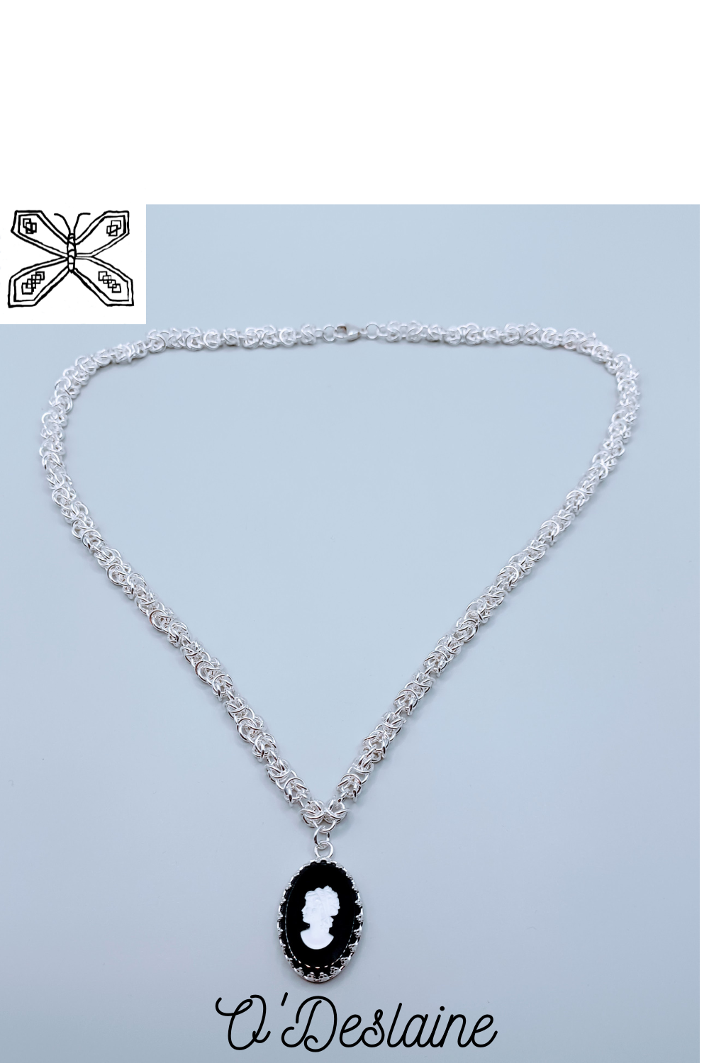 Delicate Lady is a medium-weight necklace made with silver-plated premade jump rings connected into a Byzantine chainmail pattern, with a silver-plated lobster claw clasp. In the center of the necklace is a black glass oval pendant with a white glass woman in the center. The black glass has a decorated bezel. This piece evokes an 1800s feel with a medieval chainmail necklace style.