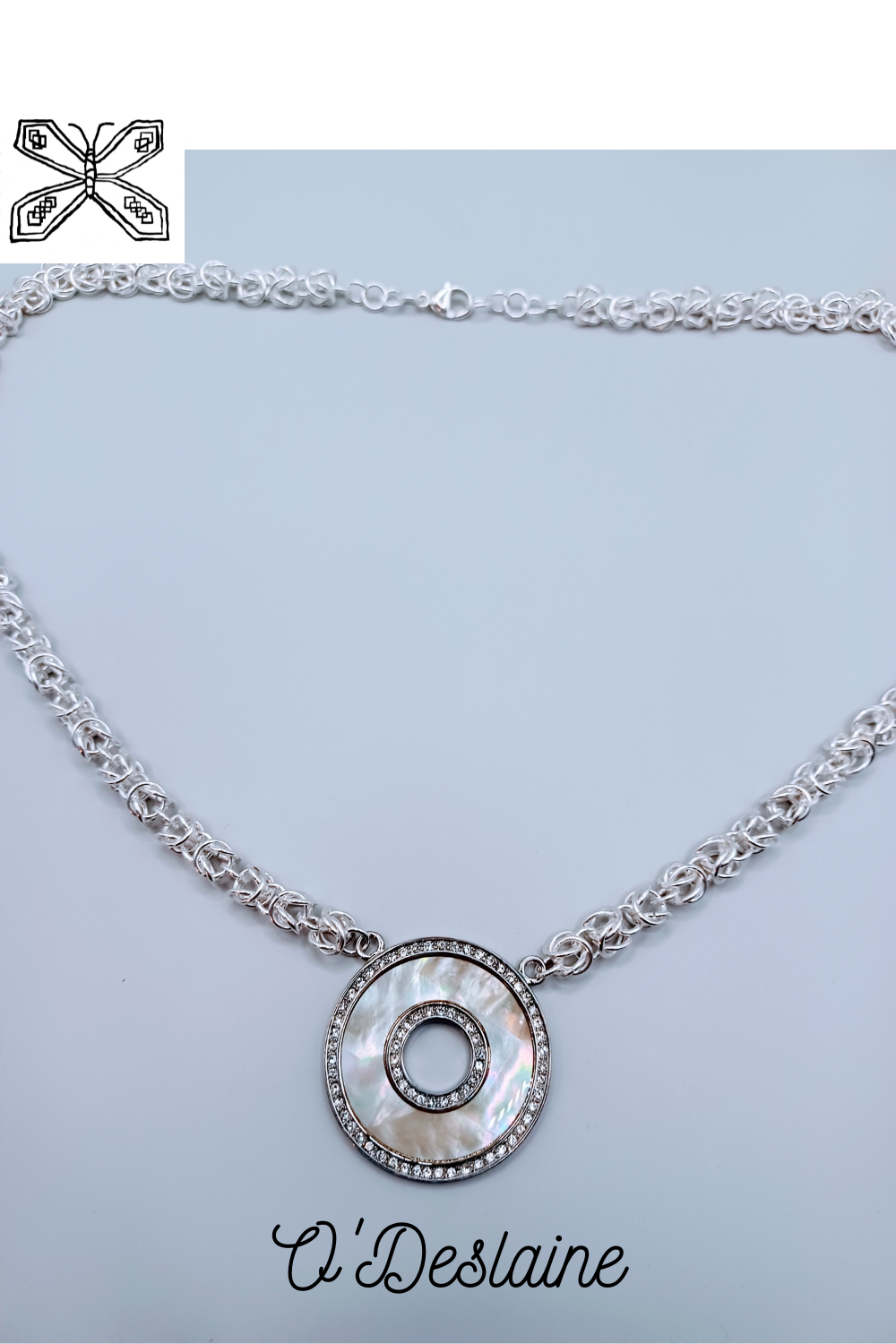 "Endless Circle is a necklace crafted with silver jump rings connected into a Byzantine-style weave. The chainmail hangs on either side of the pendant, which is a cut shell in a circular shape adorned with rhinestones both on the inside and outside of the circle. The closure features a silver-plated steel lobster claw."