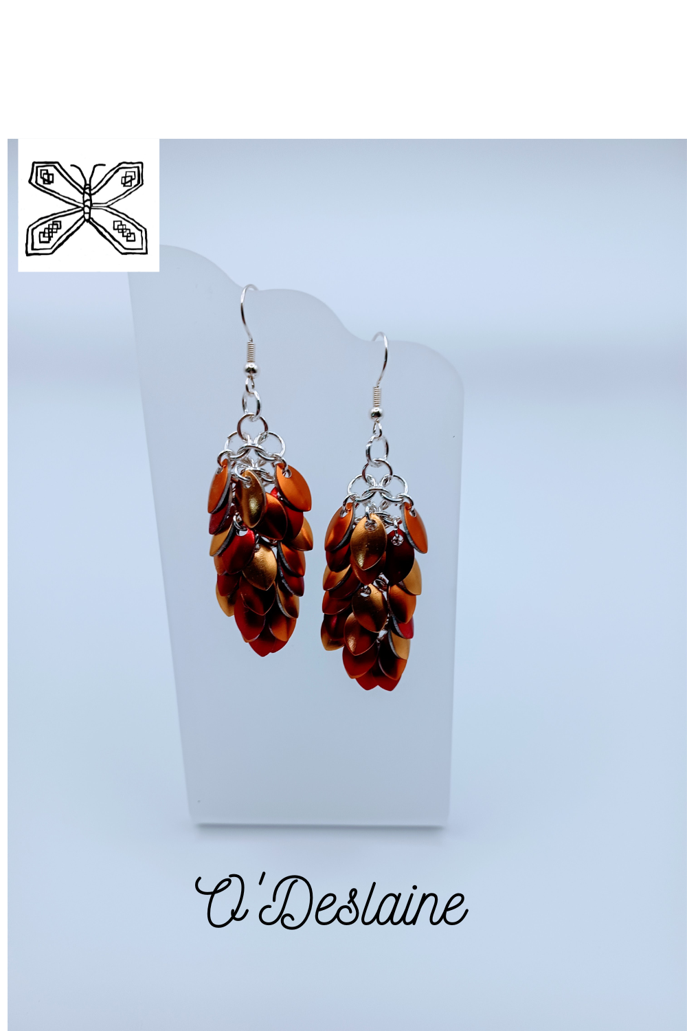 The Fire Dragon earrings feature European chainmail adorned with small dragon scales in red, orange, and yellow, arranged in three rotating rows. These lightweight, dangling earrings present a substantial look. They are attached to silver-plated fishhooks.