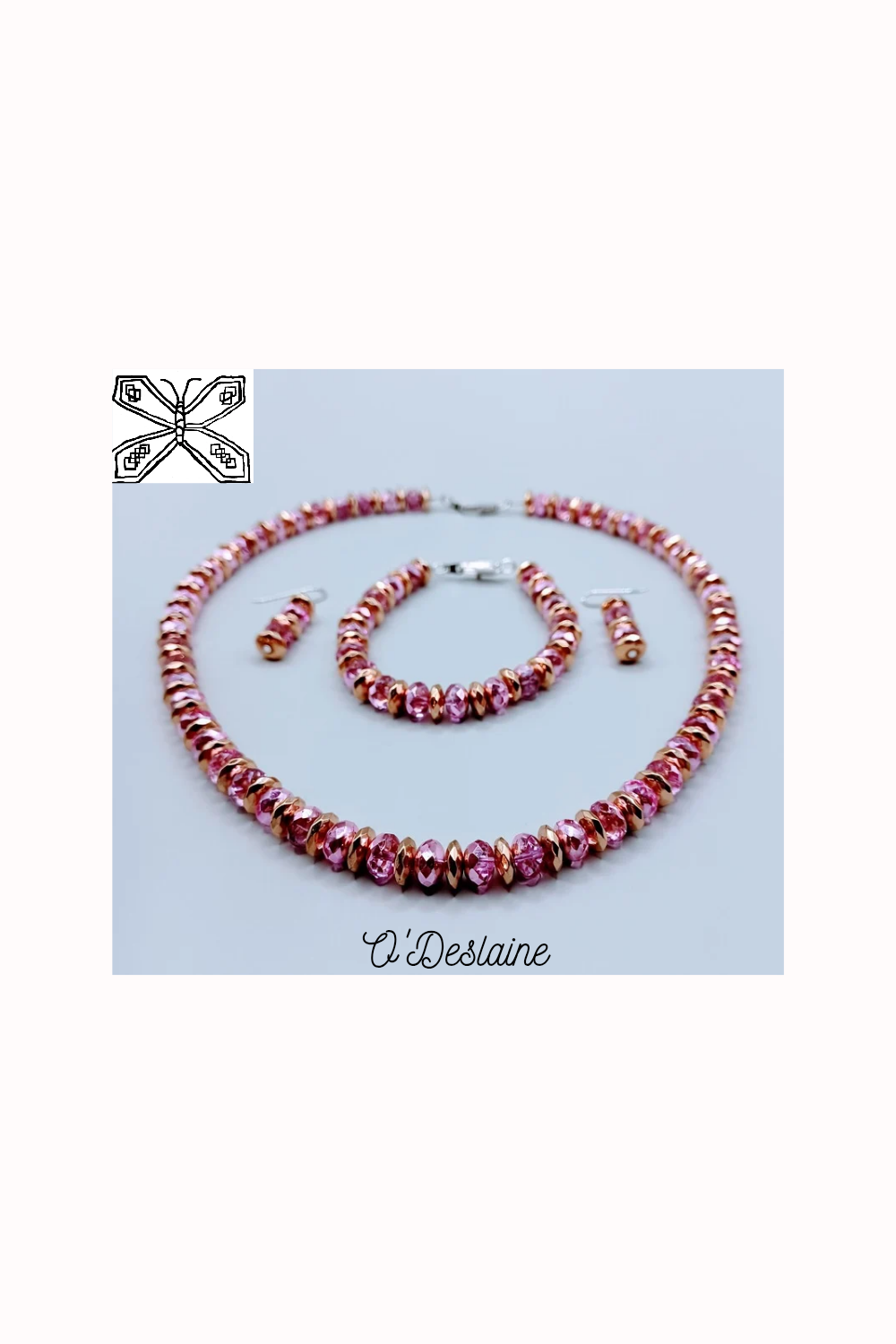 "Golden Pink" exudes elegance with its three-piece set. The necklace is crafted from Czech pink beads interspersed with gold-plated brass beads, creating a harmonious blend of colors and textures. A matching bracelet complements the necklace beautifully. Both the necklace and bracelet feature silver-plated nickel lobster claw closures, ensuring secure fastening. Completing the set are earrings featuring sterling silver hooks, adding a touch of sophistication to the ensemble.