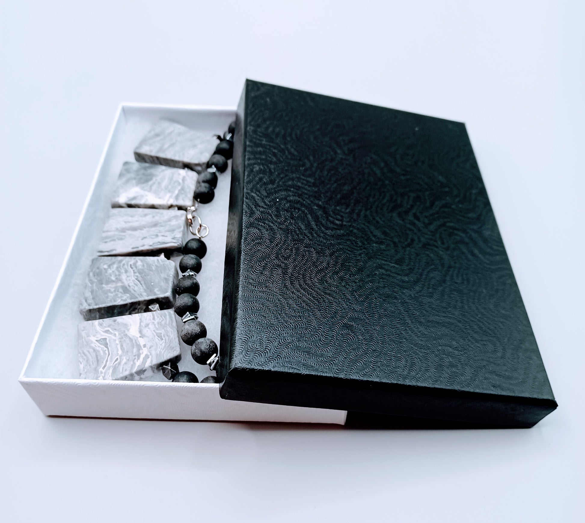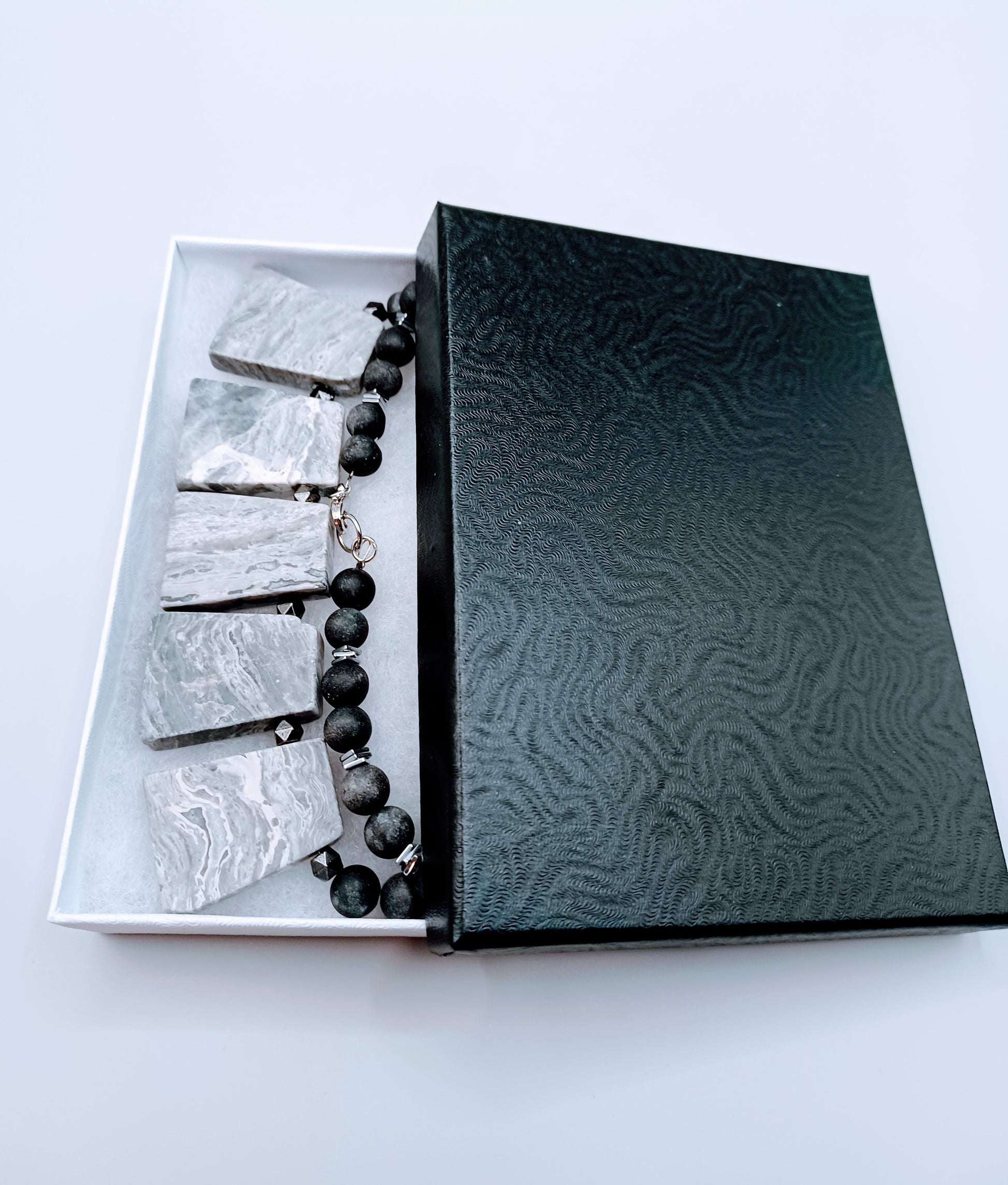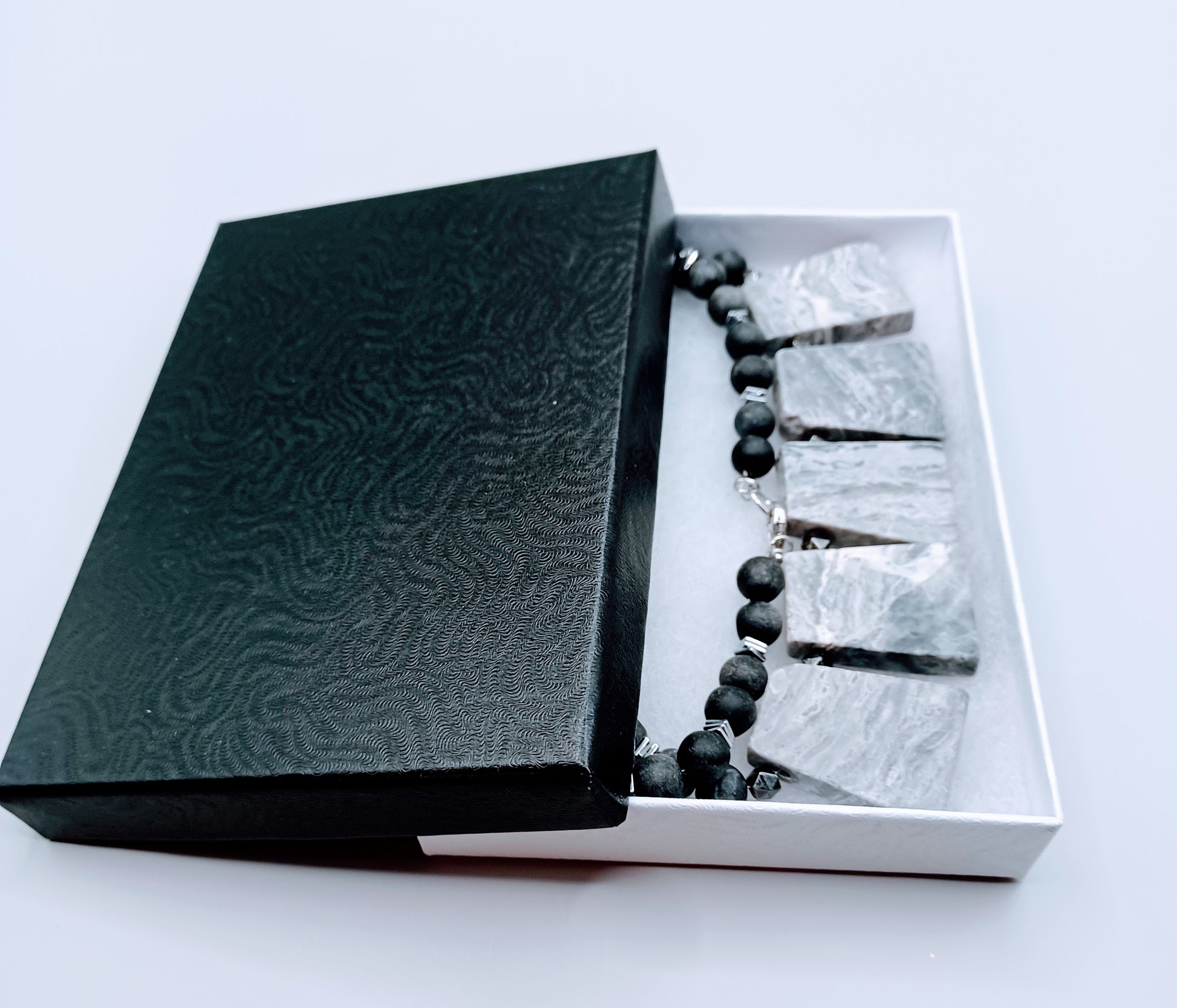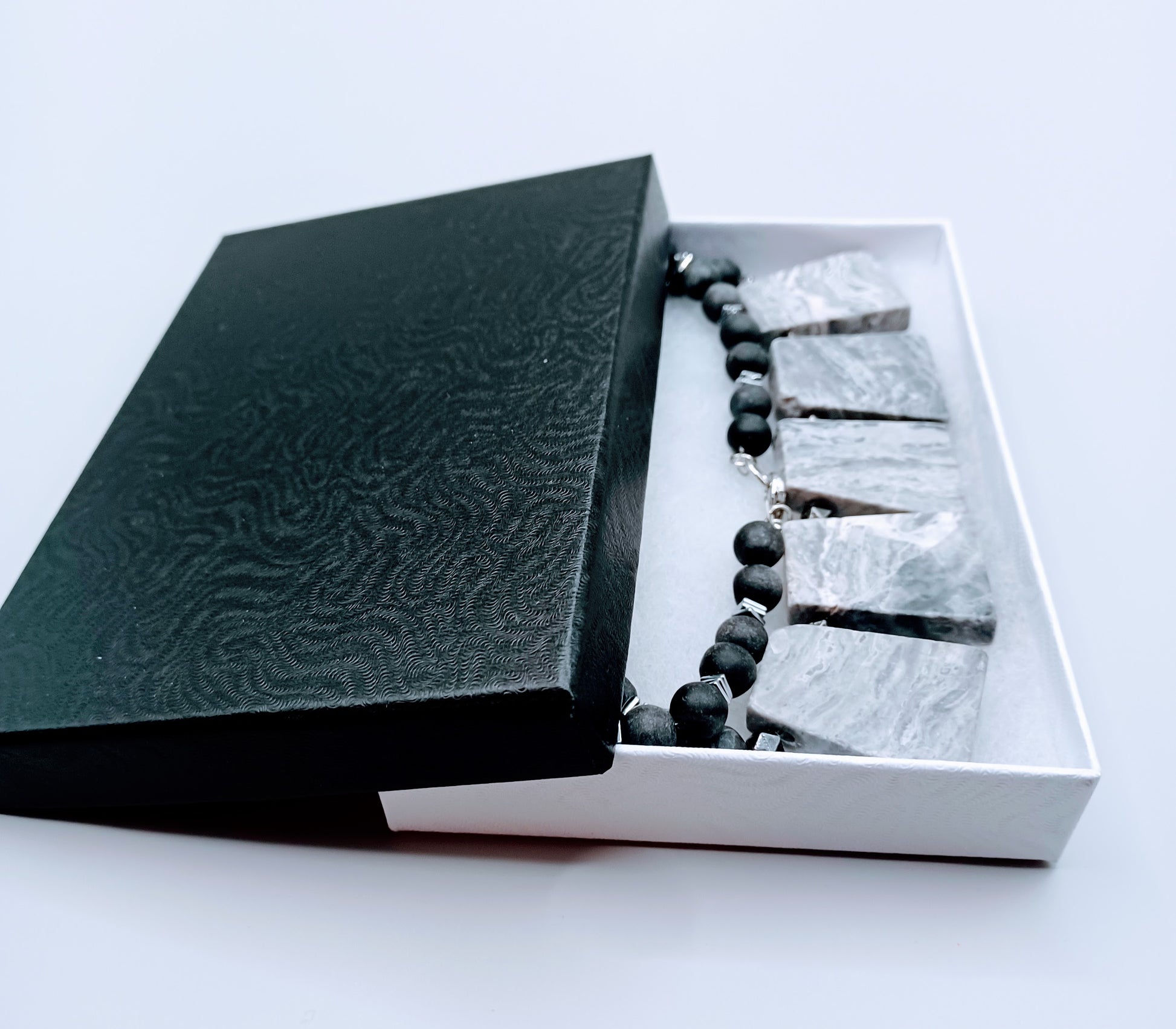 The "Marimar Necklace" exudes an aura of timeless elegance, reminiscent of ancient treasures whispered about in old tales. Crafted with meticulous attention to detail, it showcases Marimar stones, resembling the veined marble of ancient statues, interspersed with the deep allure of black stones and the sturdy presence of steel flat bead spacers.