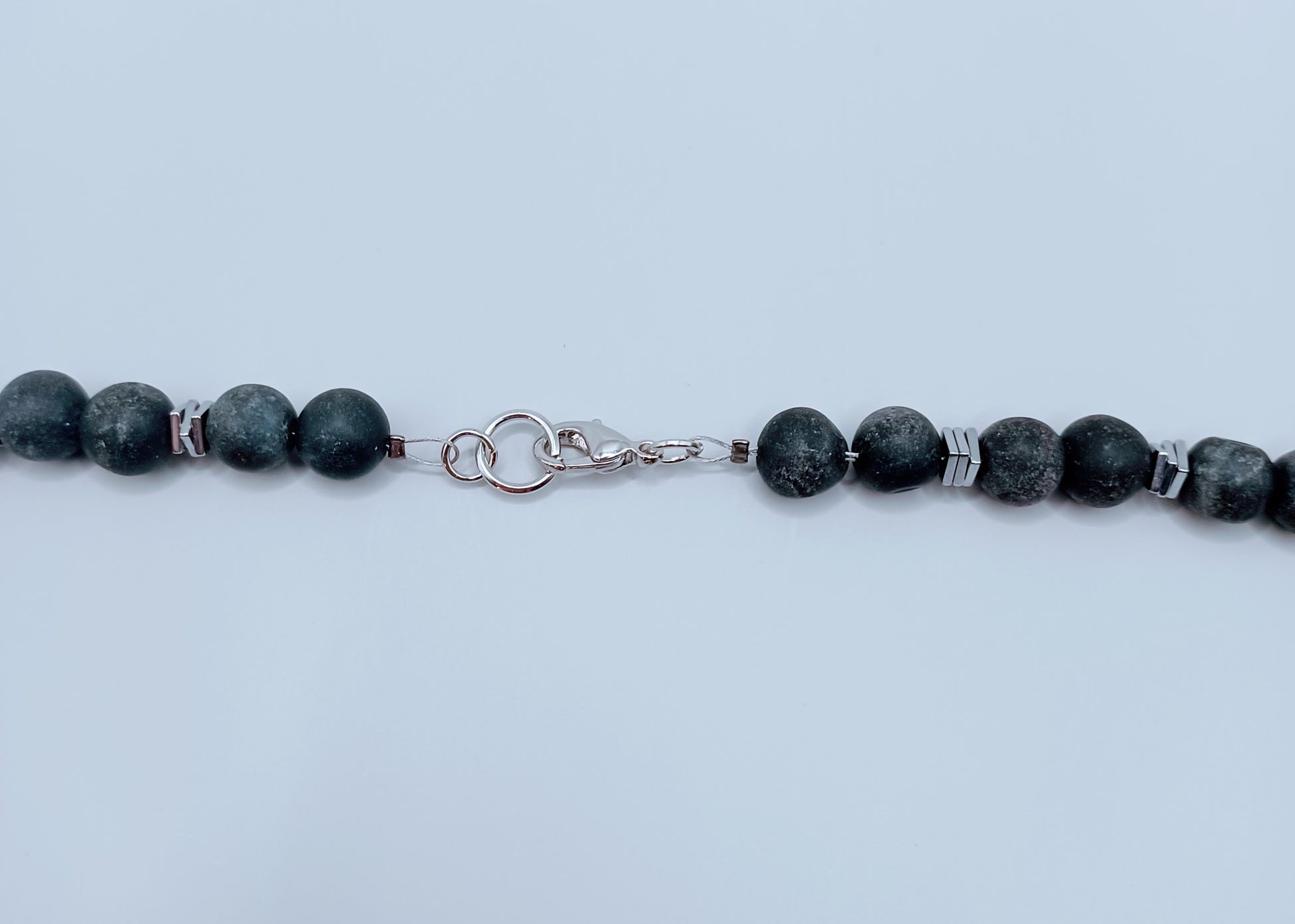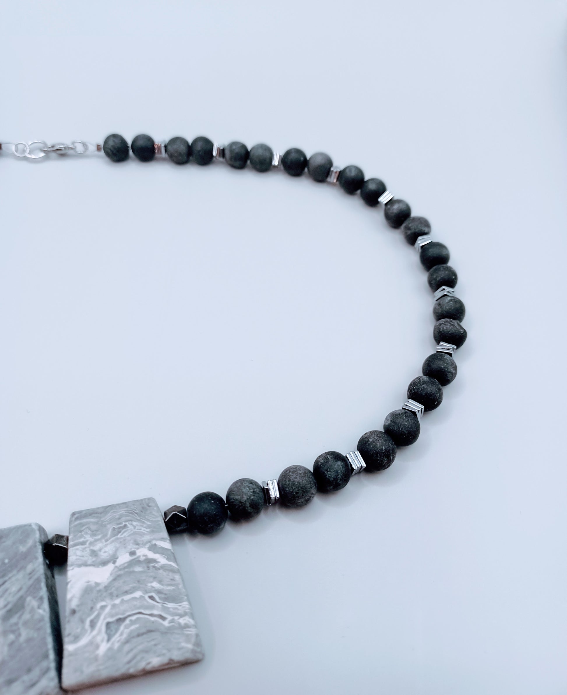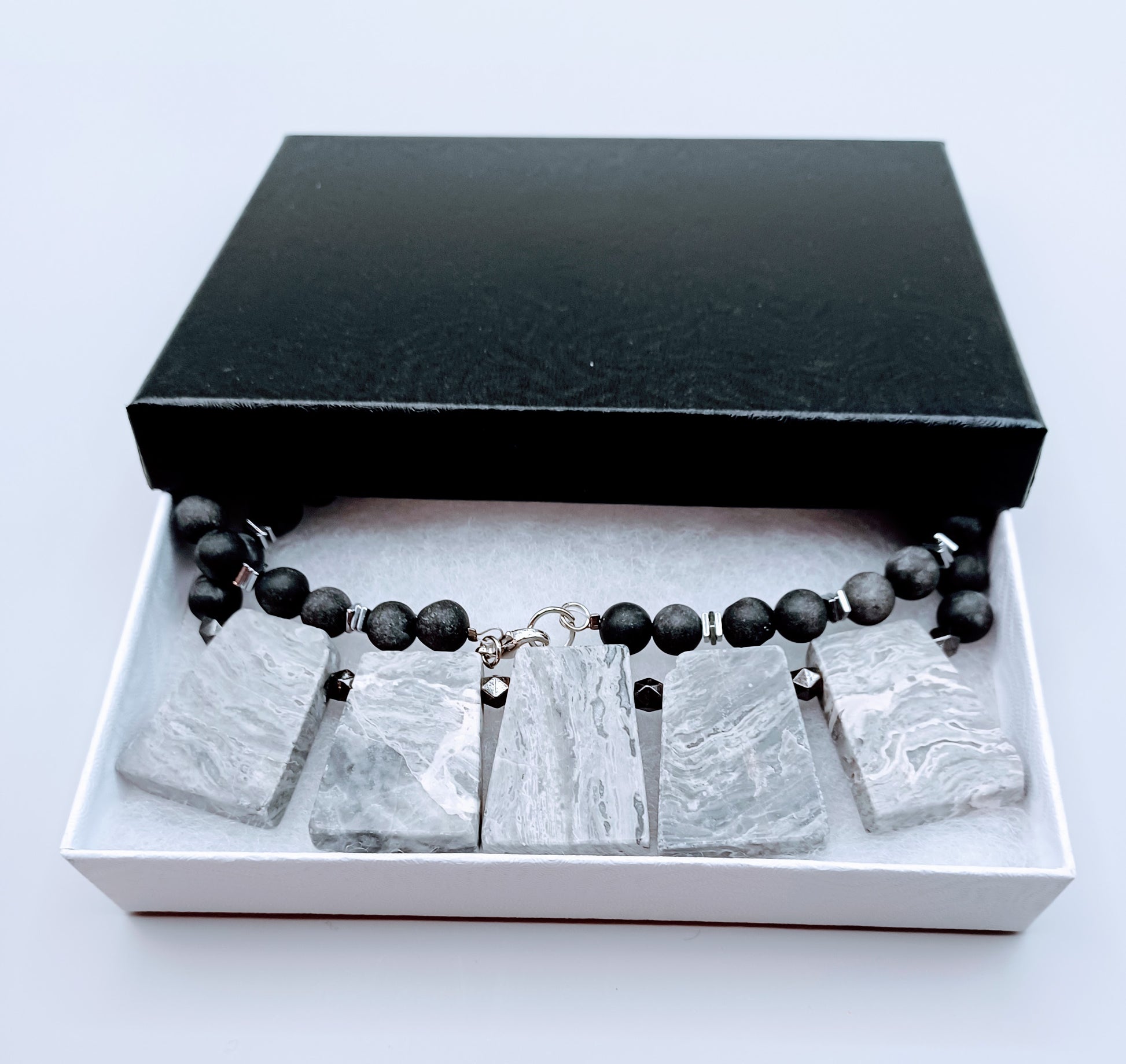 The "Marimar Necklace" exudes an aura of timeless elegance, reminiscent of ancient treasures whispered about in old tales. Crafted with meticulous attention to detail, it showcases Marimar stones, resembling the veined marble of ancient statues, interspersed with the deep allure of black stones and the sturdy presence of steel flat bead spacers.