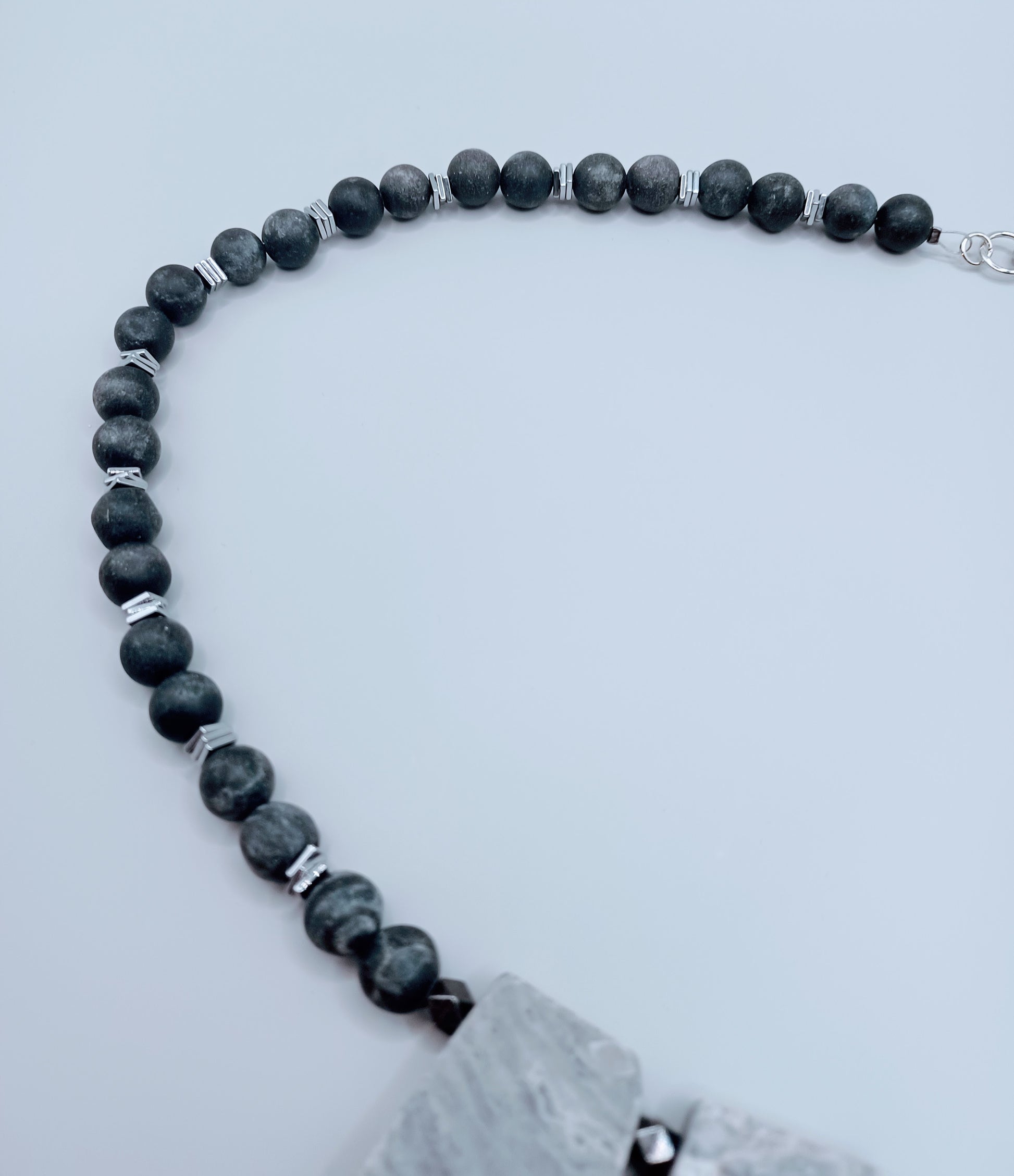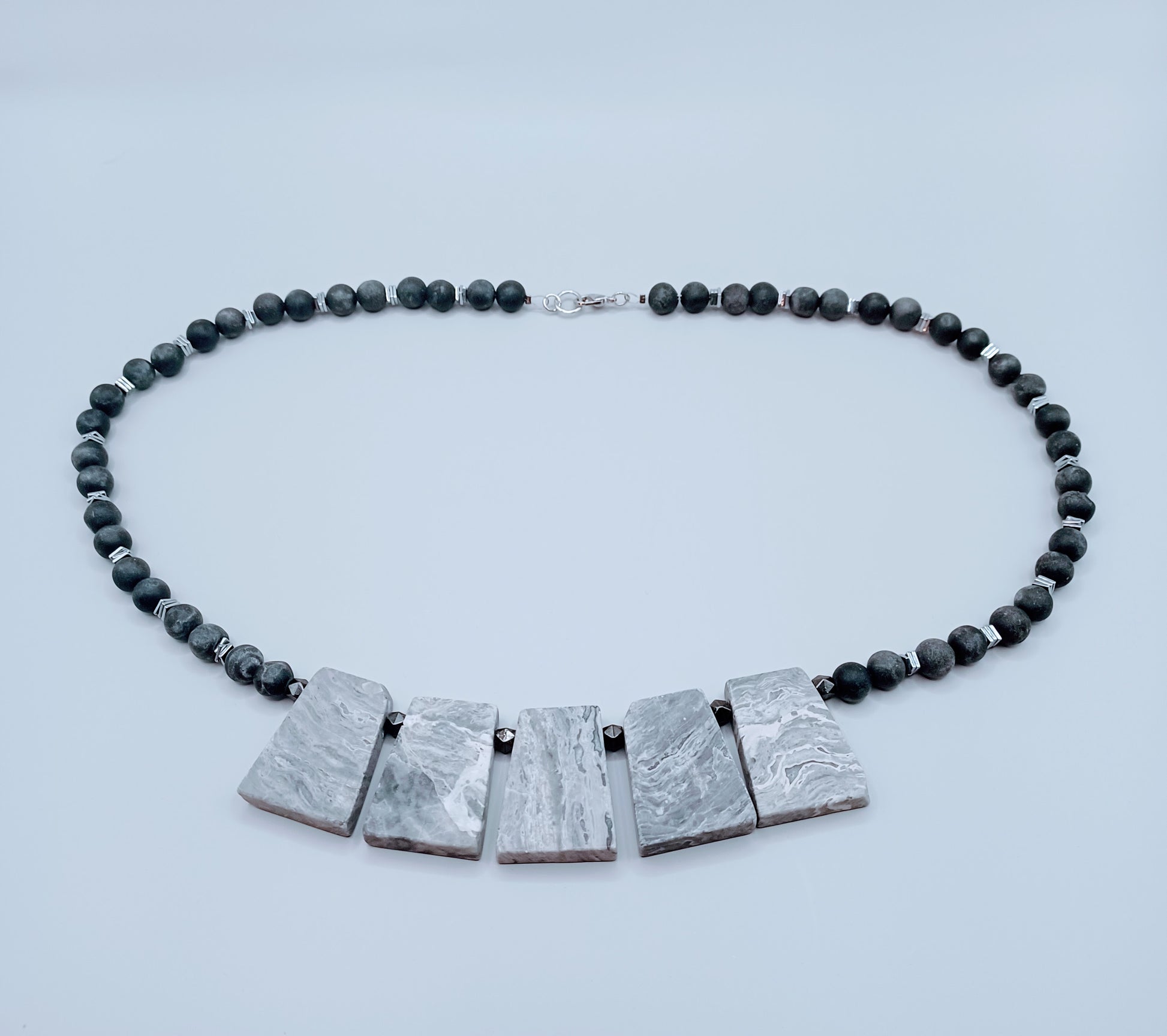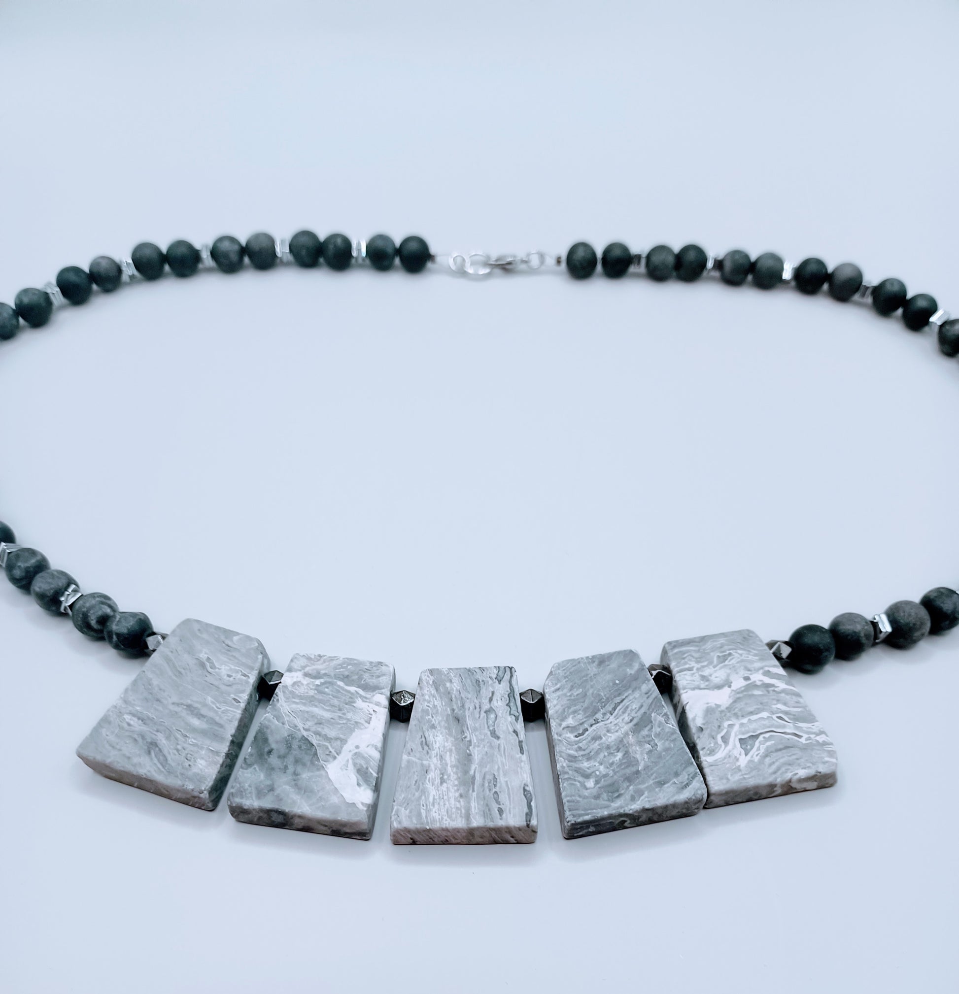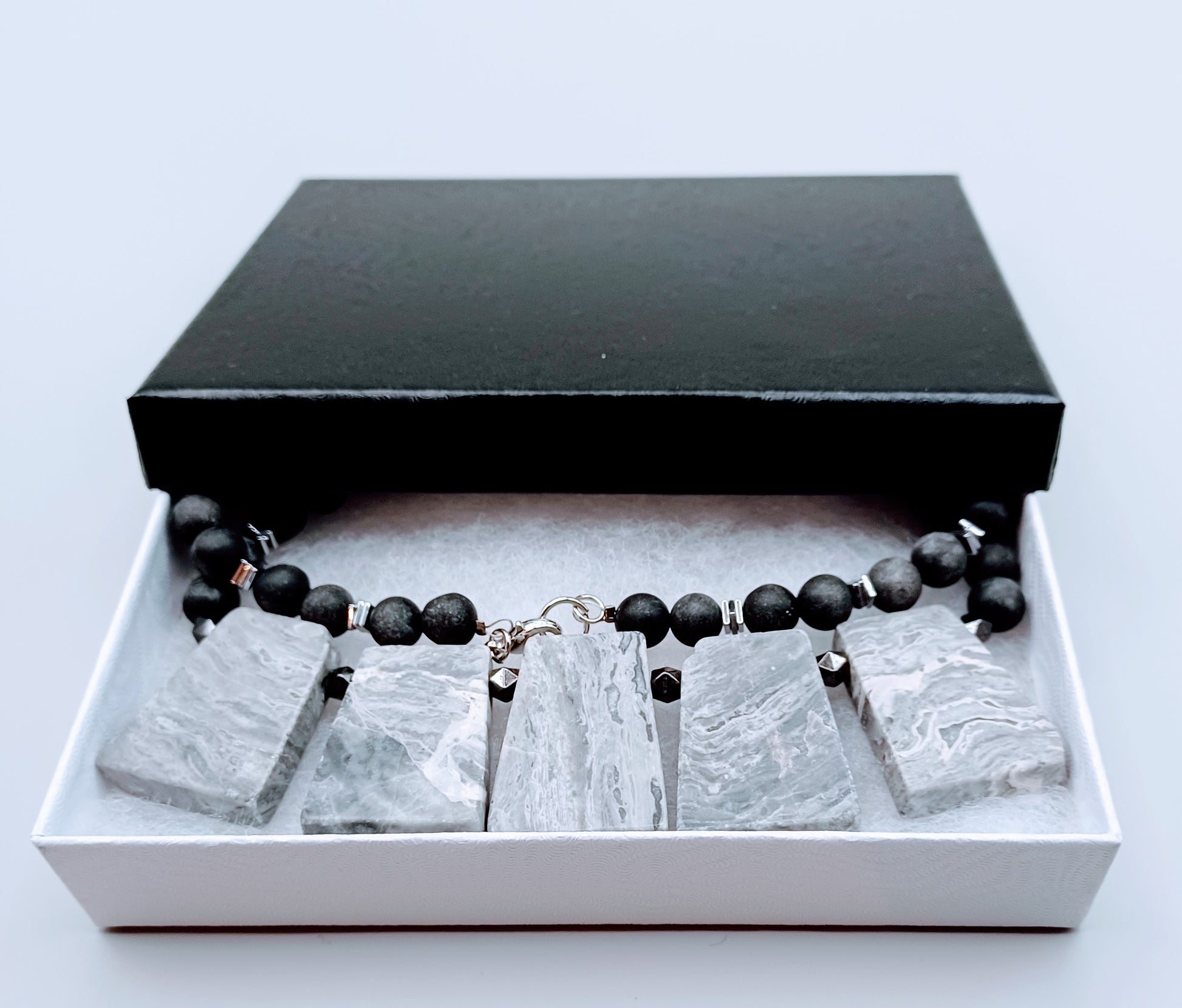 The "Marimar Necklace" exudes an aura of timeless elegance, reminiscent of ancient treasures whispered about in old tales. Crafted with meticulous attention to detail, it showcases Marimar stones, resembling the veined marble of ancient statues, interspersed with the deep allure of black stones and the sturdy presence of steel flat bead spacers.
