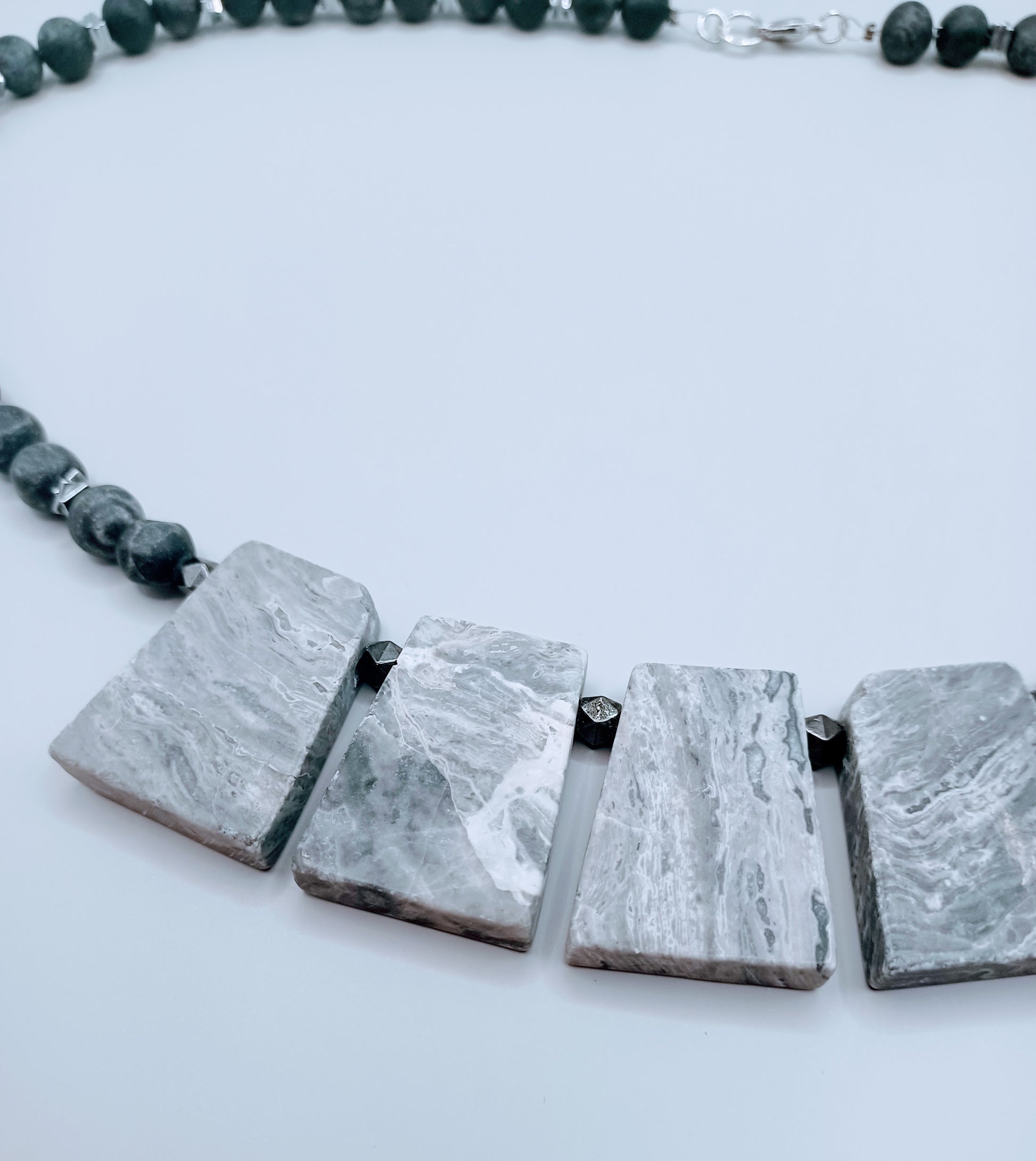 Intricately arranged upon bead wire, these elements come together in a symphony of understated sophistication. The Marimar stones, positioned proudly at the necklace's heart, stand as monuments to nature's artistry, while delicate metal beads punctuate their grandeur with subtle grace.