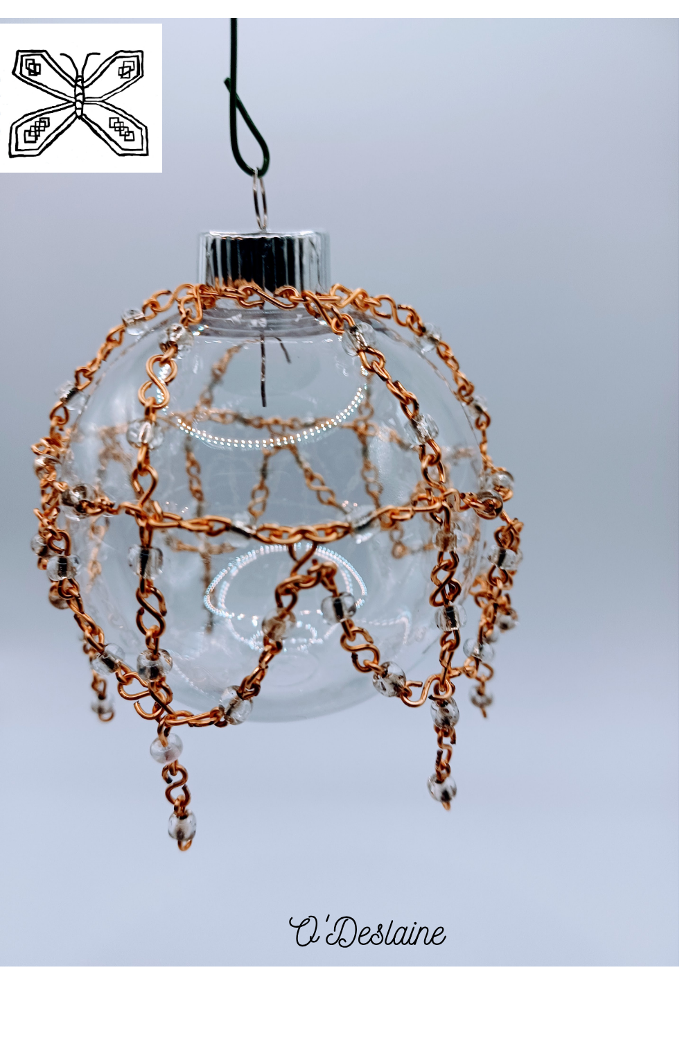 Sun Catcher Globes are crafted from small, clear plastic Christmas globes. Adorning the exterior is a delicate chain made of brass, with each link featuring a single seed bead. This chain forms a pattern and dangles elegantly. The ornament is equipped with a green hook, allowing you to display it in the brightest windows around your home or, if you prefer, on your Christmas tree.